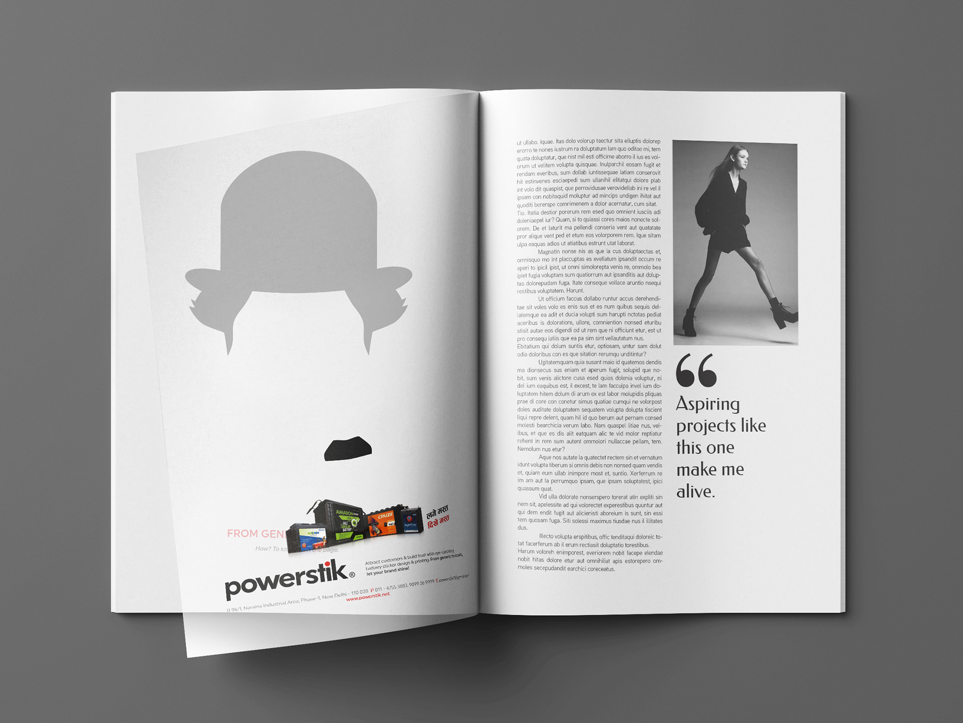 The brief was to signify the essence of branding to the unorganized battery manufacturers. The medium was magazine. The idea was to tell how the certain elements of personalities became so identical with them. But if not projected properly, there is the threat of misconception as well - the use of transparent sheet establishes just that.